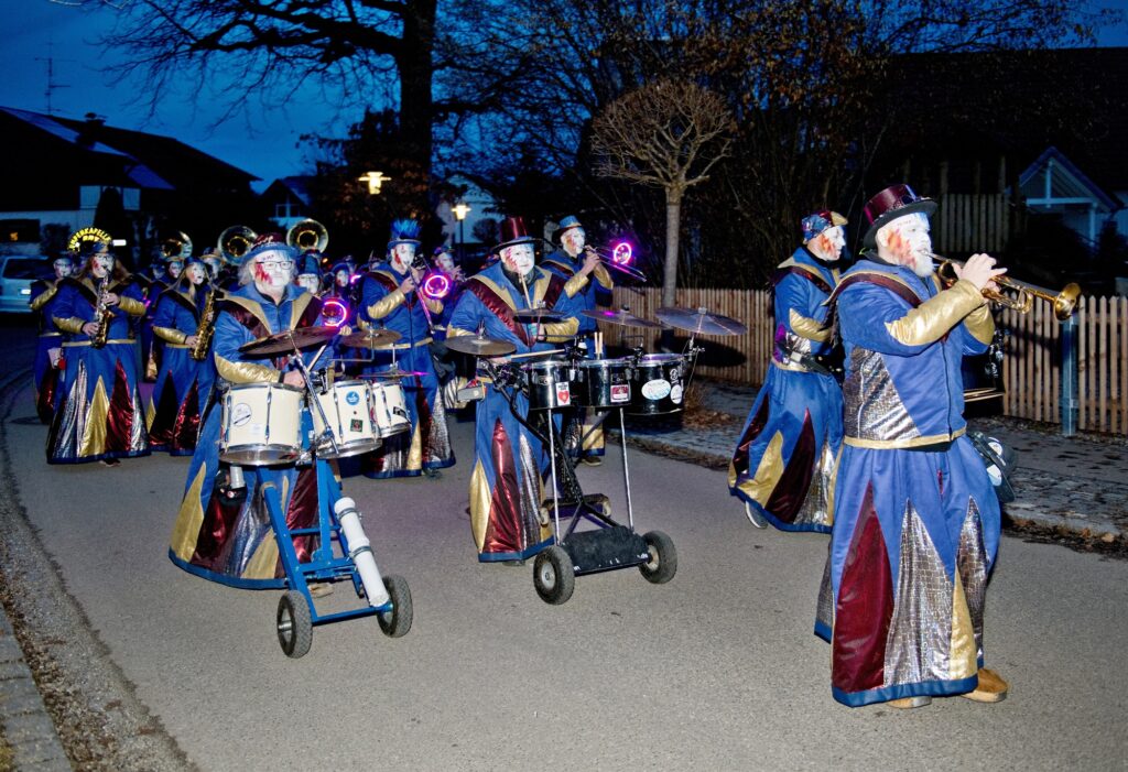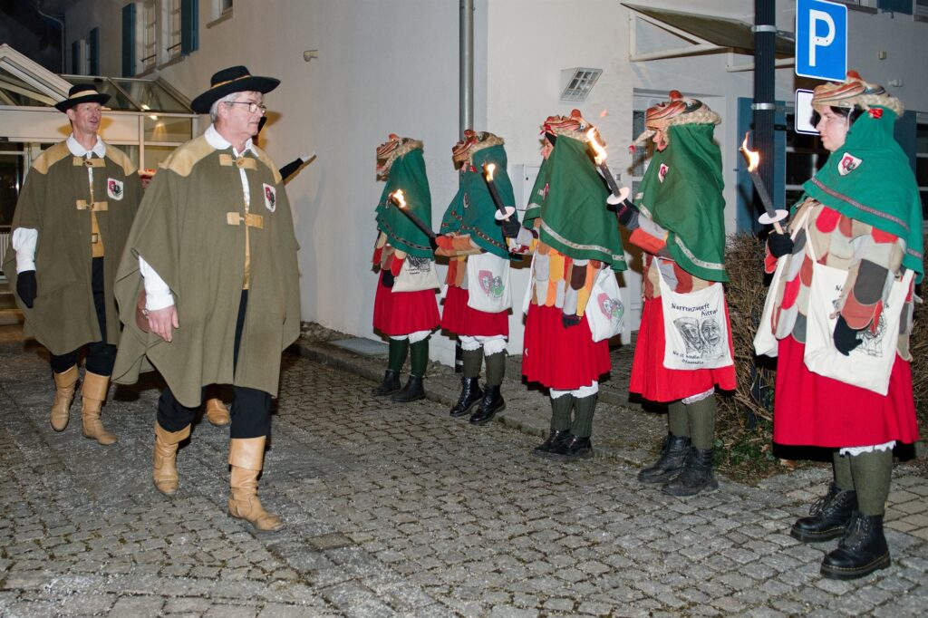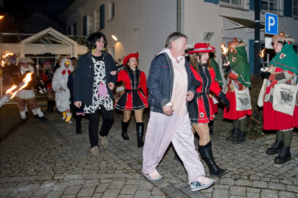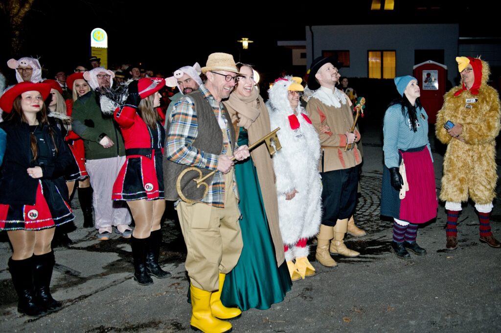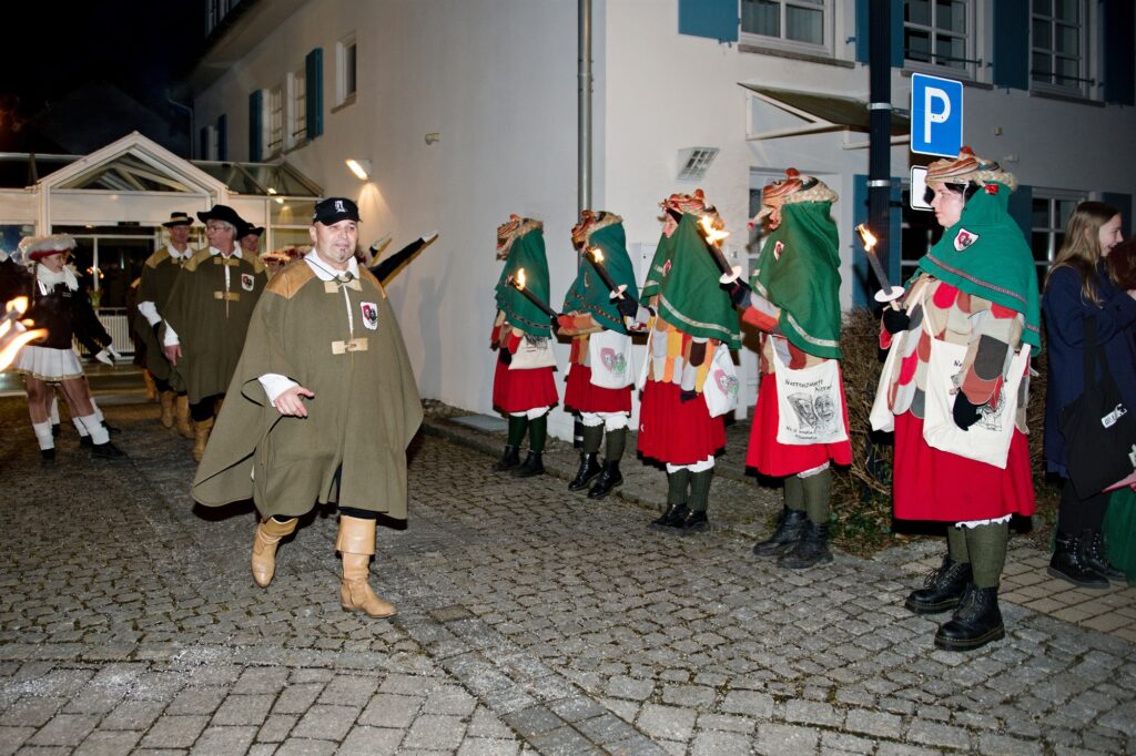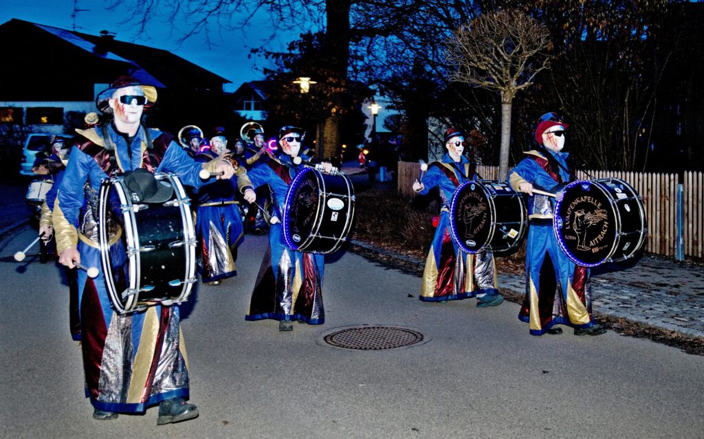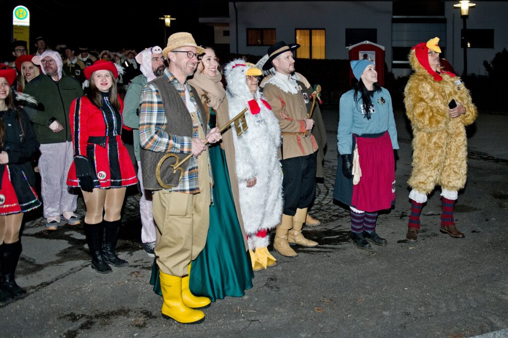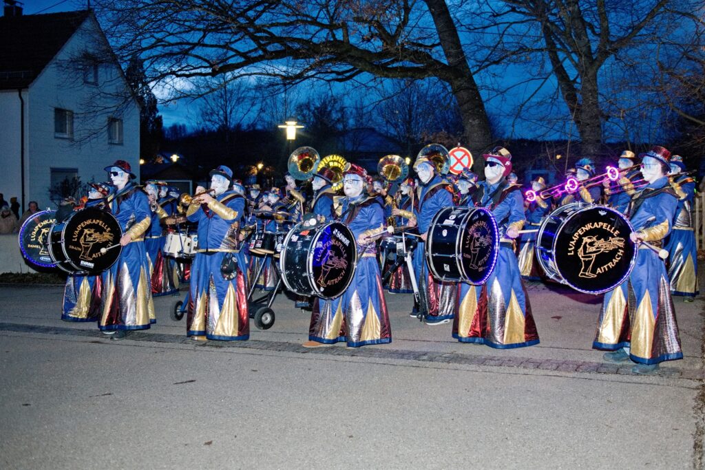 Die heimische Lumpenkapelle blies und trommelte zum Angriff und zur Machtübernahme, danach zog ein langer Fackelzug zur Festhalle in die „Tierhalle“, getreu dem Motto der diesjährigen Aitracher Fasnet „Auf dem Bauernhof“. Von der Aitracher Lumpenkapelle wurde den Besucher gleich richtig in der wunderschön dekorierten Festhalle eingeheizt.