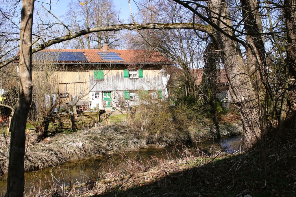 Leben im Einklang mit der Eschach: Ressourcen heben, gestern wie heute: Während an der Eschach noch die Wasserkraft eines alten Sägewerks genutzt wird, glitzert moderne Photovoltaik auf den Dächern – ein Sinnbild für den sanften Wandel in Altmannshofen.
