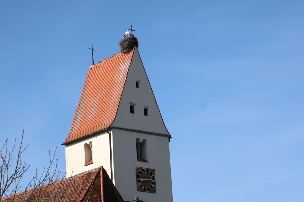 Hoch oben auf St. Vitus: Das Storchennest gehört zum Dorfbild wie die Kirchturmuhr. Hier oben blicken die Adebare auf ein Dorf, das seine Traditionen – wie etwa die Ritte der Blutreiter – stolz bewahrt.