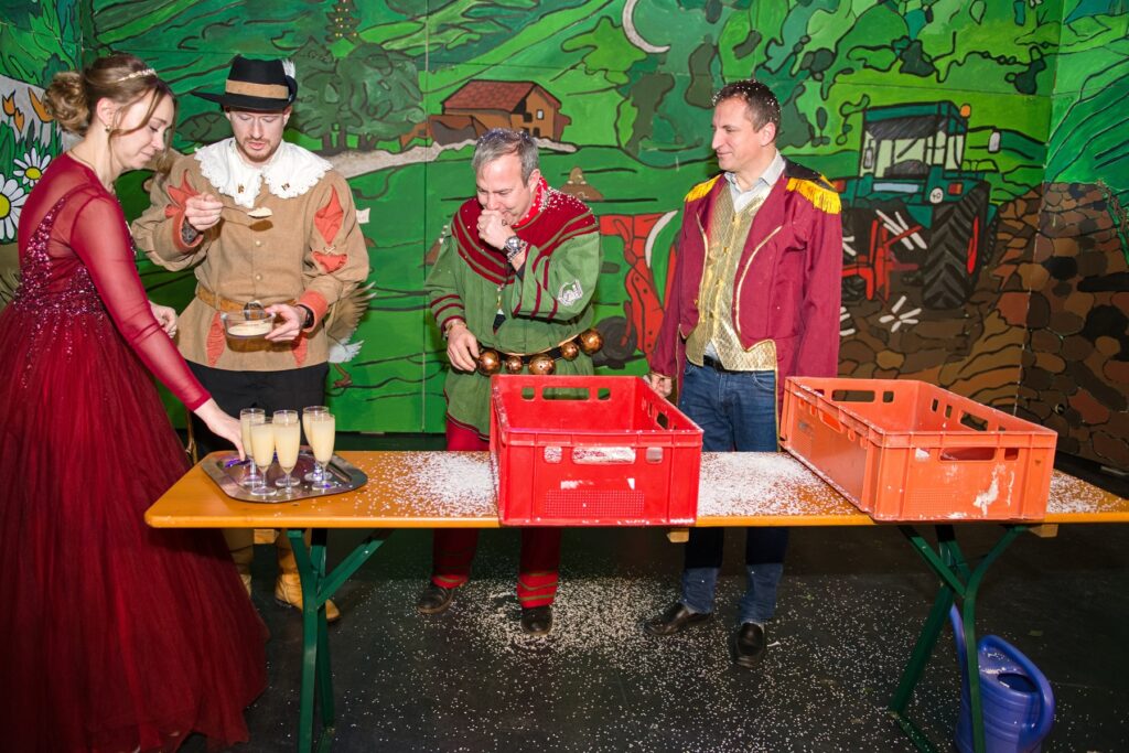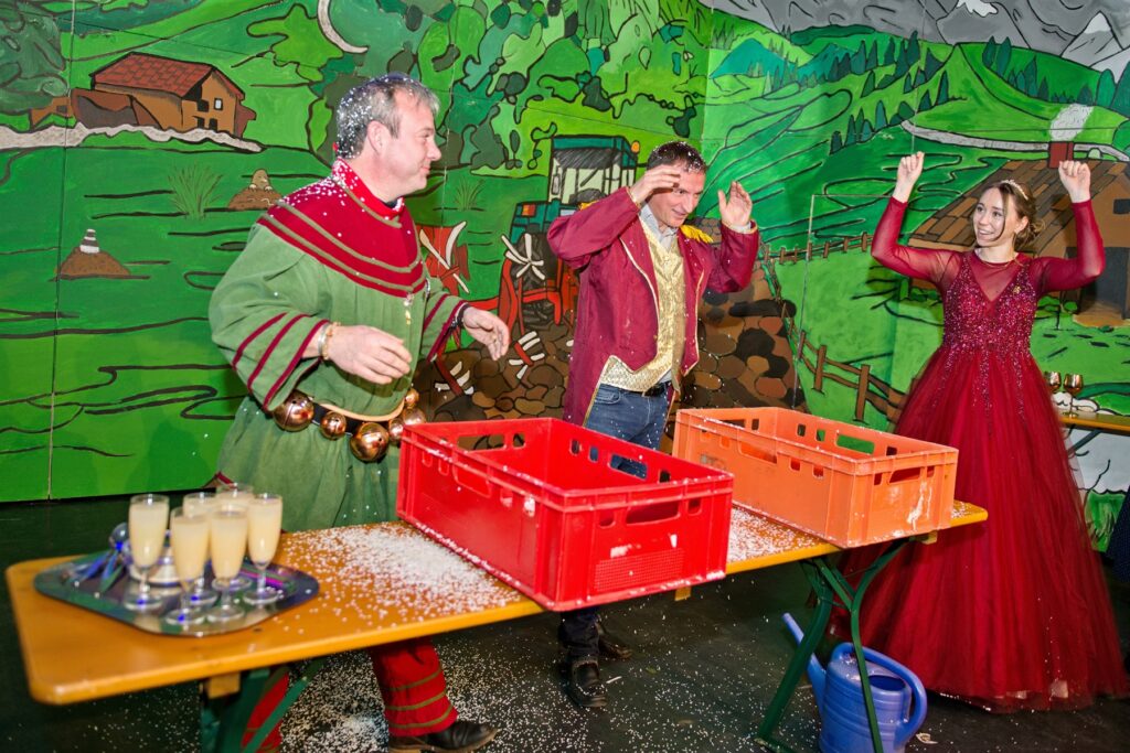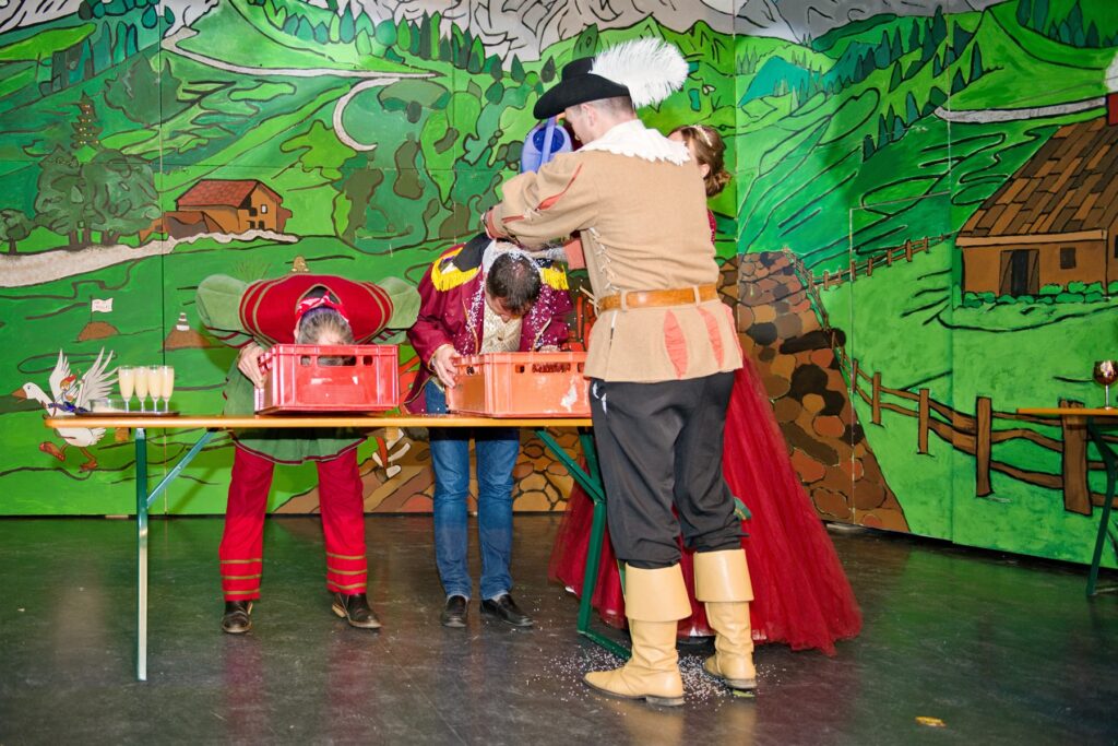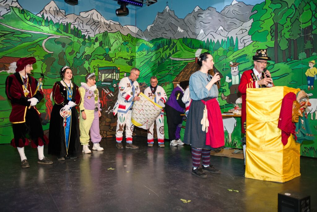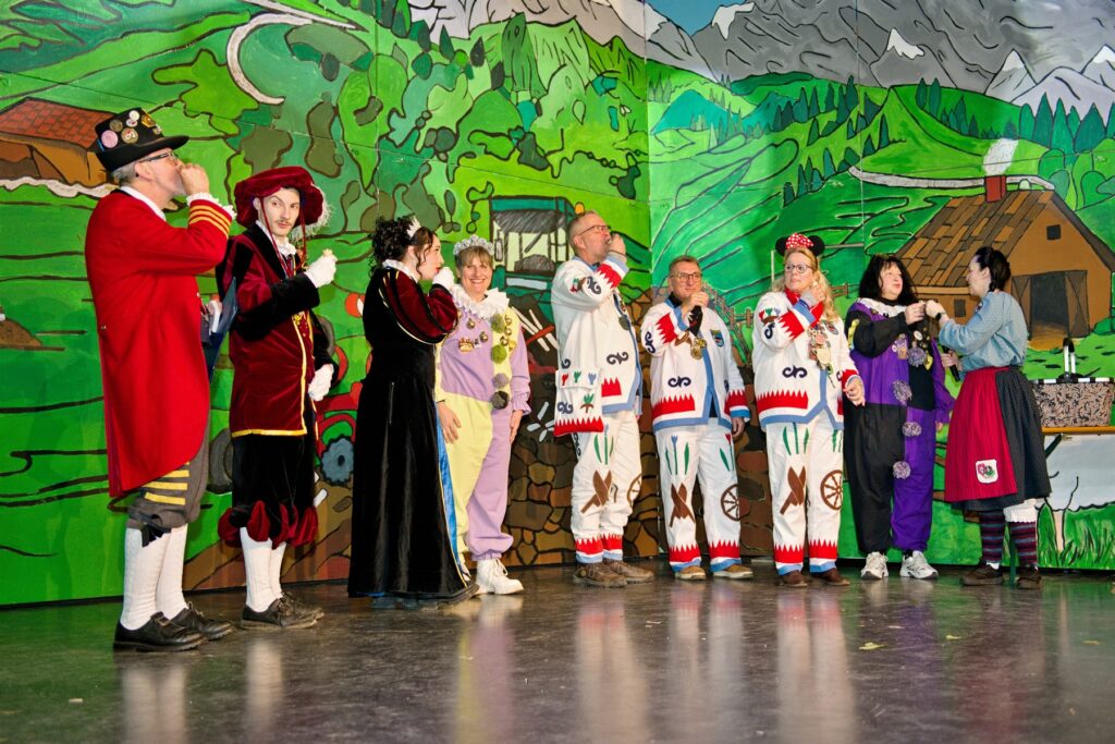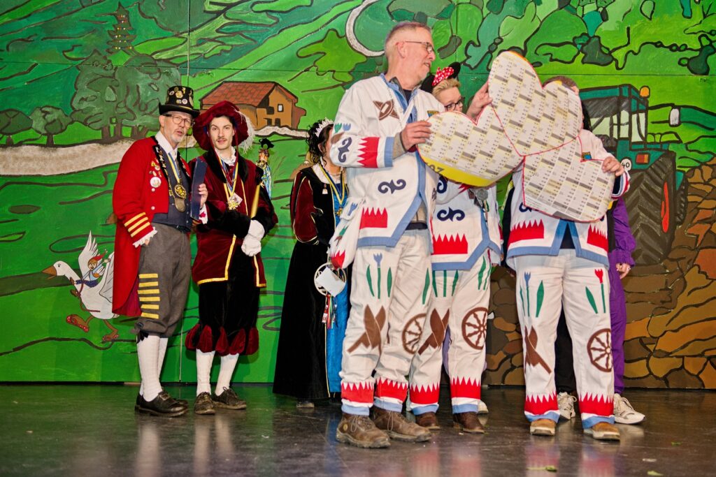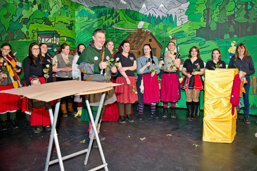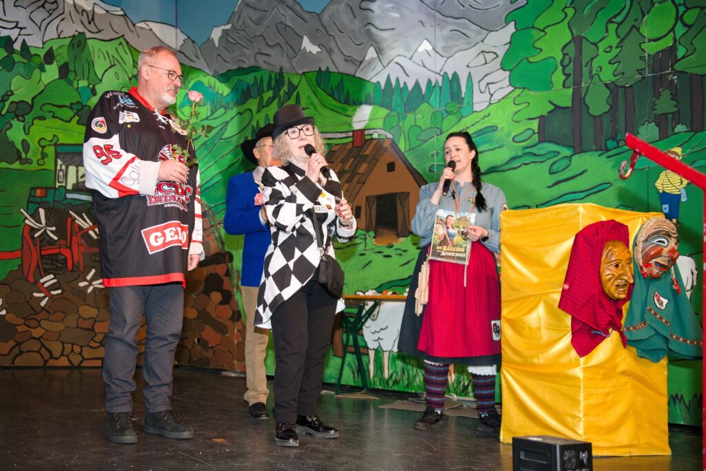 Mit dem Aichstetter Zunftmeister Bernhard Ranz ging es wieder zur Tagesordnung über, dieser überreichte den anwesenden Frauen jeweils eine Rose, wie es zum Valentinstag üblich ist. Sein Aichstetter Gefolge forderte Susa und Co. zum Puzzle auf, fast wäre es auf Anhieb gelungen.