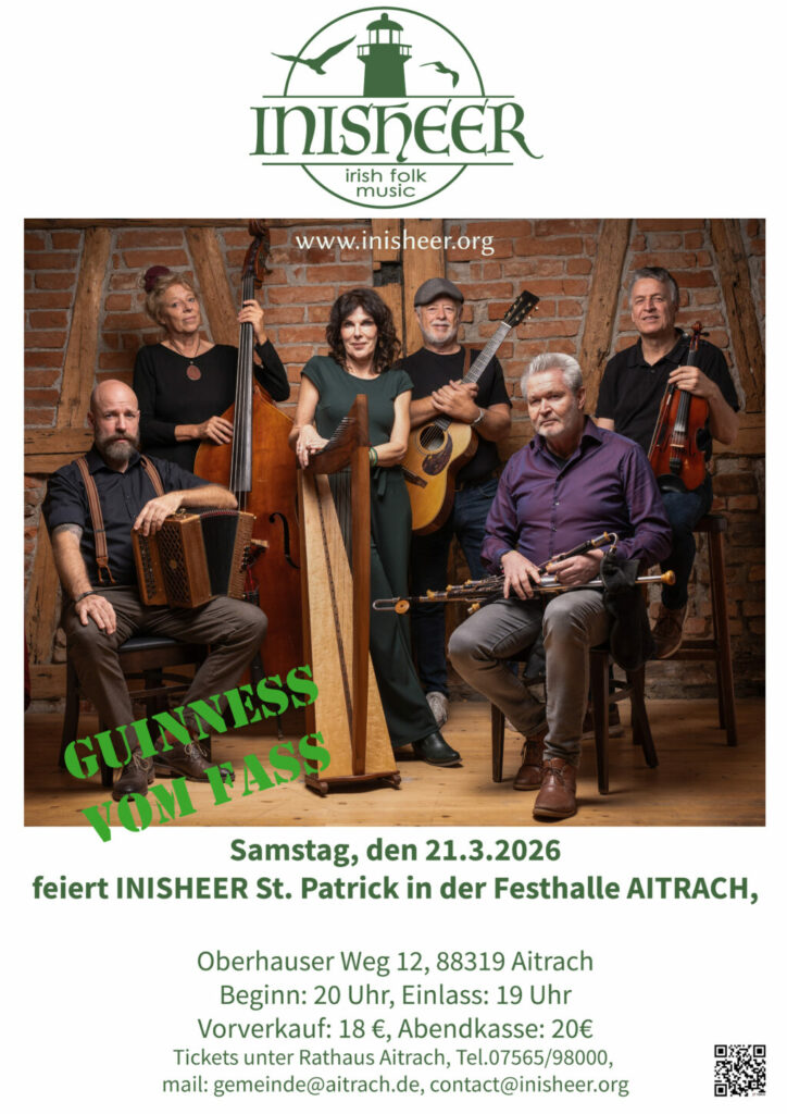 Kartenreservierung: contact@inisheer.org; Tel. 0151 614 650 97; gemeinde@aitrach.de, Tel. 07565/98000; Abendkasse: 20 €; Vorverkauf: 18 €