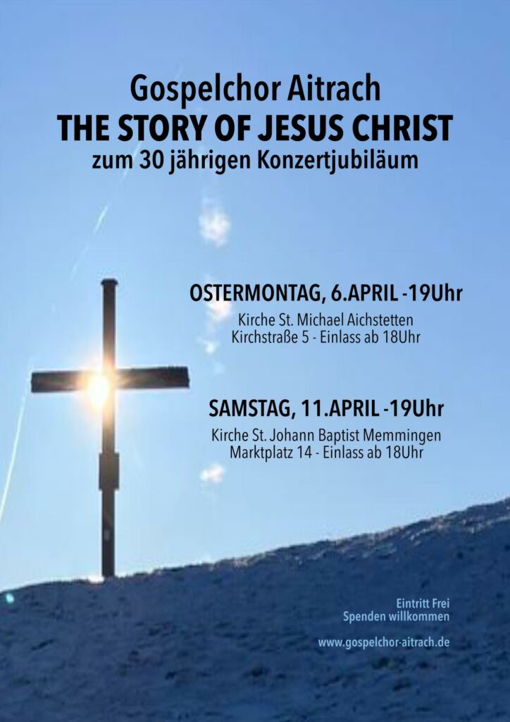 Aitrach – Zum 30 jährigen Konzertjubiläum startet der Gospelchor Aitrach bereits im Frühjahr mit einem ganz besonderen Projekt und 2 Konzerten. Hinter dem Titel: The story of Jesus Christ – verstecken sich dem Chor bereits seit langer Zeit bekannte Gospels und ganz neu einstudierte Songs aus der damaligen Rockoper „Jesus Christ Superstar“ (1971 in New York City uraufgeführt). Ostermontag, 6. April, um 19.00 Uhr in der Kirche St. Michael in 88317 Aichstetten und am Samstag, 11. April, um 19.00 Uhr in der Kirche St. Johann Baptist in 87700 Memmingen.