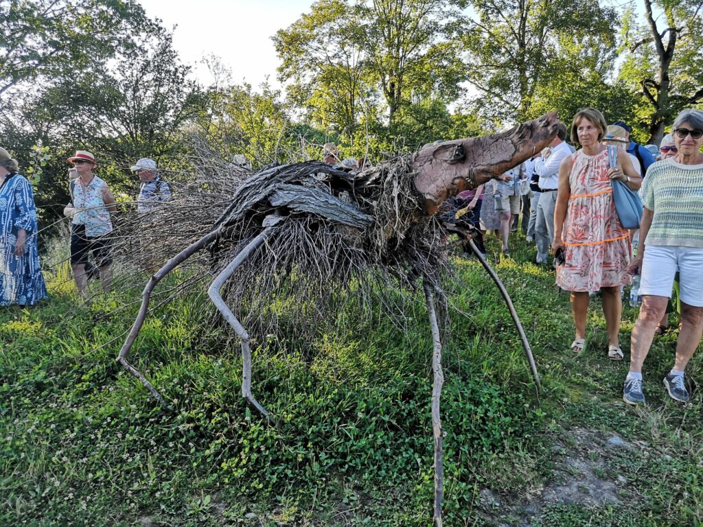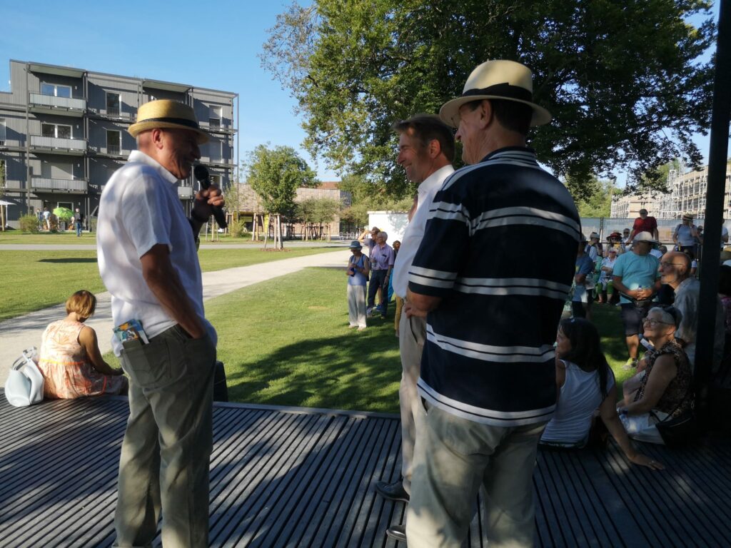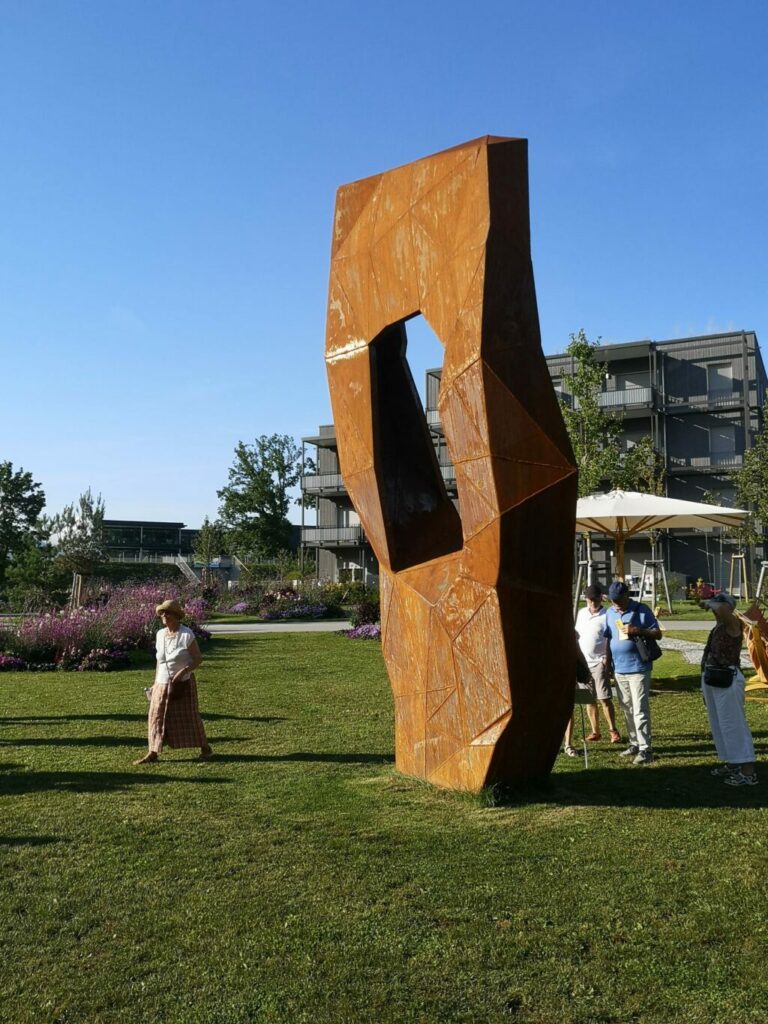 Wangen – Am letzten Dienstag (6.8.) herrschten auch am Spätnachmittag noch hochsommerliche und durchaus schweißtreibende Temperaturen. Trotzdem hatten sich über 100 bestens gelaunte Besucher eingefunden, um bei einem von Oberbürgermeister Michael Lang beschwingt moderierten Gang über das Gelände der Landesgartenschau die dort gezeigten Kunstwerke zu würdigen.