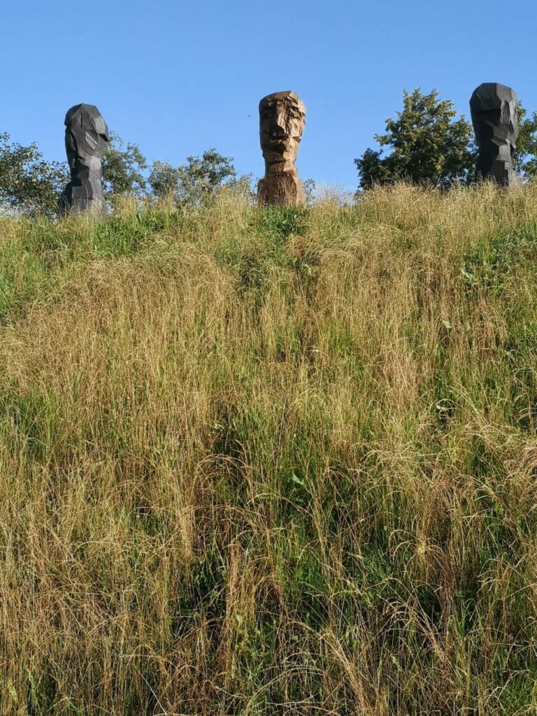 Auch für die drei Köpfe von Klaus Prior würde man sich wünschen, sie könnten auf Dauer auf ihrem imposanten Platz verbleiben. Bei ihnen handelt es sich um unterschiedlich patinierte Bronzeabgüsse einer von dem Künstler, der lange in Kißlegg gearbeitet hat, ursprünglich aus Holz geschnitzten Form. Wie die berühmten urzeitlichen Monumentalköpfe auf den Osterinseln scheinen die drei Skulpturen auf einem steilen Hügel gleichsam über das Gelände der Gartenschau zu wachen.