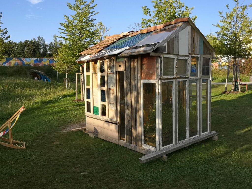 Neben solchen in ihren Dimensionen und in den verwendeten Materialen so eindrücklichen Großskulpturen tun sich diejenigen Kunstwerke etwas schwer, die für eine ganz andere Tradition in der Skulptur der Moderne stehen: für das Arbeiten mit scheinbar wertlosen, gefundenen Materialien. Aber auch diese Arbeiten sprechen die Besucher stark an. Das kleine Häuschen etwa, das Uwe Schäfer und Philipp Beck aus diversen Fundmaterialien wie alten Fenstern und Dachziegeln zusammengefügt haben, zieht die Passanten geradezu magisch an und lädt sie zum Eintreten ein. Man kann dort verweilen, kann auch seine Eindrücke in einem Buch hinterlassen. Das kleine Gehäuse mit dem Titel „Warten VII“ ist auf seine ganz eigene Weise ein eher stiller, magischer Ort zwischen dem quirrligen Treiben auf der Gartenschau.