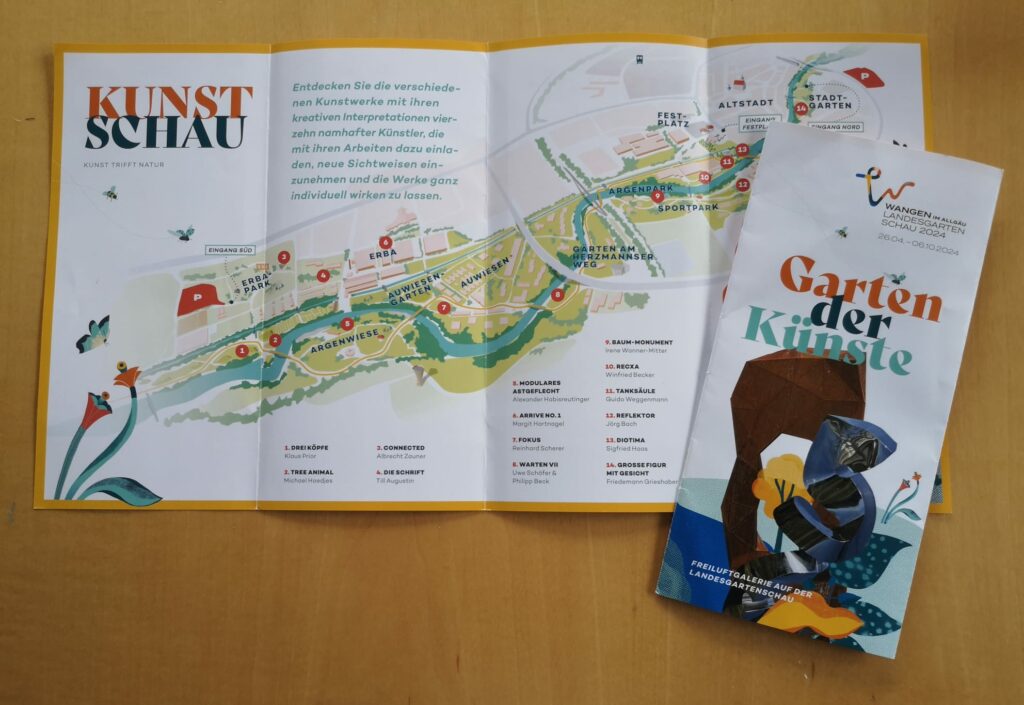 Mit Hilfe des Faltblatts „Garten der Künste“ kann man sich gut auf eigene Faust auf den Weg durch diese Freiluftgalerie innerhalb der Landesgartenschau machen. Bei den einzelnen Kunstwerken liefern dann kleine Texttafeln jeweils Informationen zu den Künstlern und ihren Überlegungen.