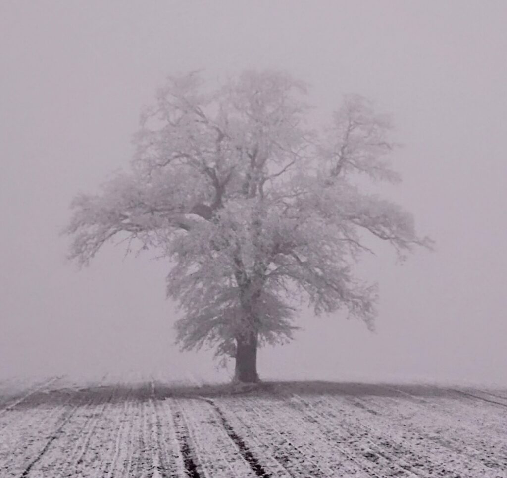 Karl Webers Vierjahreszeitenmotiv: der einsame Baum zwischen Gaisbeuren und Reute, am 29. Dezember nebelumfangen.