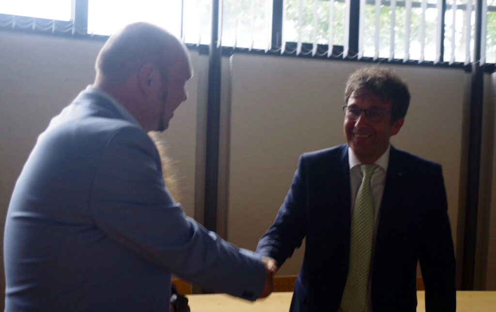 Als das Ergebnis feststeht, gratuliert Dominik Merk im Sitzungssaal Bürgermeister Matthias Burth zum Wahlsieg.