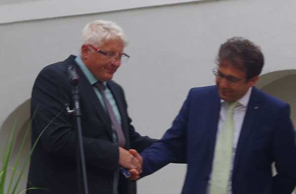 Wahlleiter Michael Halder gratuliert Matthias Burth zur Wiederwahl.