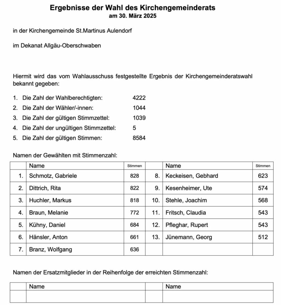 Aulendorf (rei) – In der katholischen Kirchengemeinde St. Martin Aulendorf waren bei den Kirchengemeinderatswahlen am 30. März 4222 Katholiken über 16 Jahre wahlberechtigt. Von diesen gingen 1044 zur Wahl. Das ergibt eine Wahlbeteiligung von 24,7 Prozent. Von den 13 Kandidaten erreichte Gabriele Schmotz mit 828 Stimmen das beste Ergebnis. Das Pfarramt hat uns nachstehendes Ergebnis übermittelt: