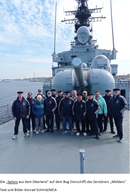 Die Gäste aus Süddeutschland hatten natürlich einige Highlights auf ihrer To-Do-Liste. Am ersten Tag stand der Besuch der Fregatte „Sachsen“ an. Ein junger Leutnant führte routiniert durch fast alle Abteilungen des Schiffes, das bei manchem Besucher sprachloses Erstaunen über soviel geballte Technik hinterließ. Ganz oben auf der Agenda stand natürlich auch eine Hafenrundfahrt mit einer Barkasse und der Besuch des Marinemuseums. Nach einer kurzen Begrüßung durch ein ehemaliges Besatzungsmitglied des stillgelegten Zerstörers „Mölders“ flogen wie auf Bestellung noch einige Eurofighter der Marineflieger aus Nordholz über die ausgemusterten Kriegsschiffe. Gerade diese alten, stillgelegten Relikte der sechziger bis Zweitausender Jahre erweckten bei den ehemaligen Marinesoldaten des Chores Erinnerungen an eigene längst vergangene Fahrenszeiten. Mit diesen Bildern und Eindrücken, des größten, wenngleich auch in die Jahre gekommenen deutschen Marinestützpunktes, der Museen und der gastfreundlichen Menschen hier am Jadebusen, fuhren die Sailors aus dem Schwabenland wieder zurück an ihr Schwäbisches Meer.