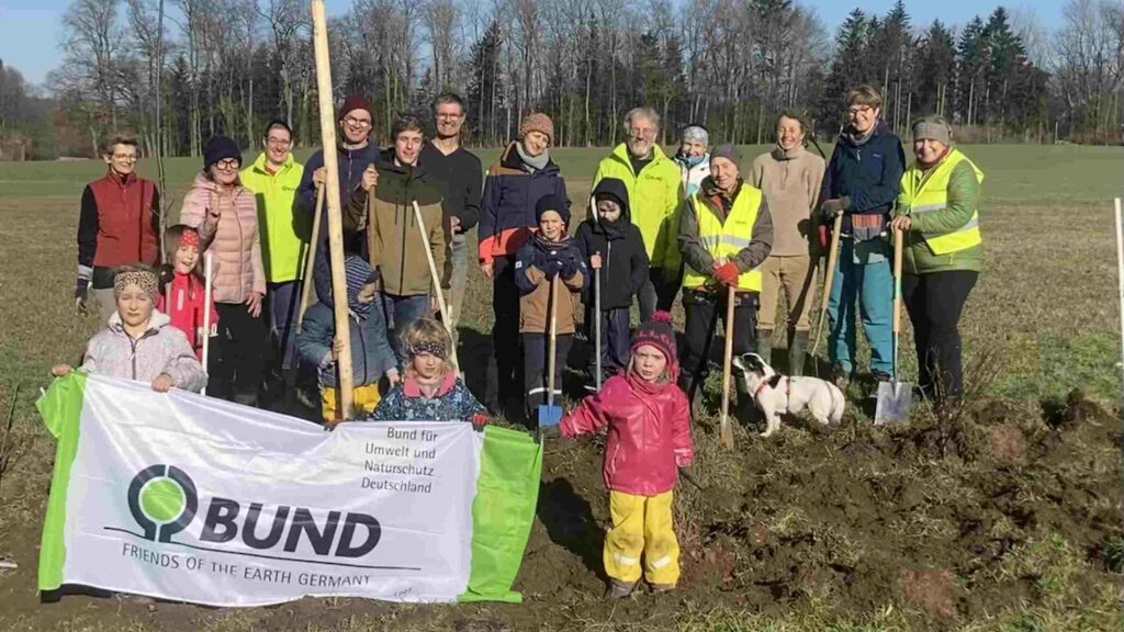 Aulendorf – Bei herrlichem Sonnenschein und frühlingshaften Temperaturen pflanzte die BUND-Kindergruppe unter Mithilfe von vielen Helfern der Ortsgruppe Aulendorf eine Naturhecke an. Mit Schaufel und Spaten sowie kräftezehrendem Pflanzlochbohrereinsatz wurden in ca. 3 Stunden 130 heimische Sträucher und drei Walnussbäume sowie drei Traubenkirschen gepflanzt.