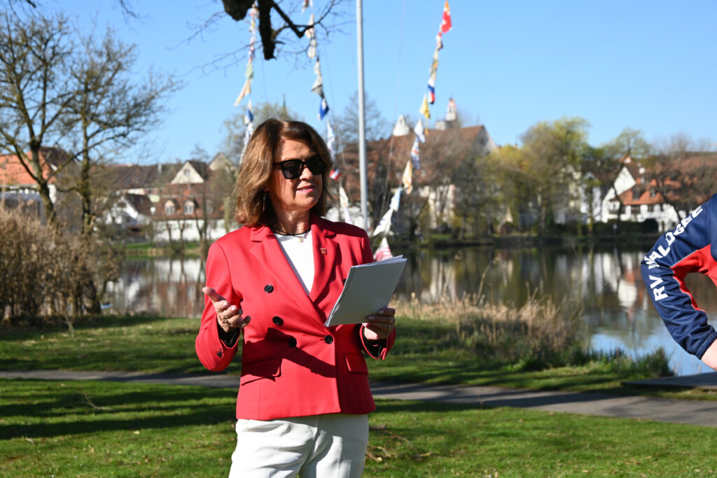 Mit den Worten „Traumwetter, Traumkulisse, Traumevent“ begrüßte Bürgermeisterin Monika Ludy (Bild) die Ruderer und überbrachte die Grüße des OB. „Für mich als alte Waldseerin und Stadtseekind ist es natürlich eine besondere Freude, hier zu sein.“ Das „Stadtseekind“ erklärte sie auch gleich: „Dort bin ich aufgewachsen, dort wohne ich und dort schaffe ich“ und deutete auf ihre drei Lebensstationen am Stadtsee.