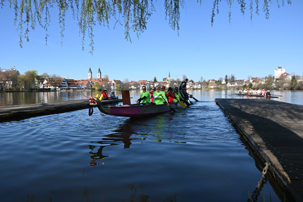 Mit dem Kommando „An die Boote“ gab Johannes Wiest den See frei. Achter, Vierer und Einer schwärmten aus und auch das frisch renovierte Drachenboot des RVW wurde zu Wasser gelassen.