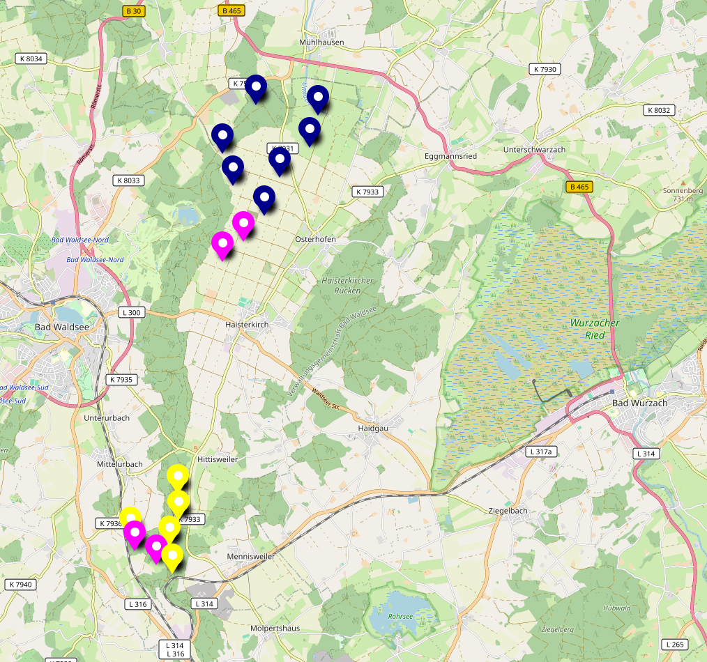 Die im Haistergau und bei Mittelurbach geplanten Windkraftanlagen (WKA): blau markiert die von der EnBW geplanten WKA, pink die WKA der Laoco GmbH, gelb der Uhl Windkraft Projektierung GmbH & Co. KG. Weiter plant laut Bürgerrunde Haistergau auch Projektierer Franz Biesinger im Haistergau WKA, deren genaue Standorte noch nicht bekannt sind. Karte entnommen der Webseite der Bürgerrunde.