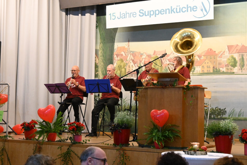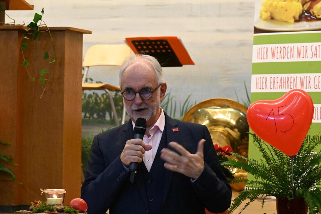 Nach seiner Begrüßung rief er Mitvorständler Wolfgang Pfefferle auf die Bühne. Zusammen erzählten sie die Entstehungsgeschichte der Suppenküche vor 15 Jahren. Wolfgang Pfefferle als Ideengeber fand in Rudi Heilig einen kongenialen Mitstreiter und so fing alles an. Heute arbeiten 35 Ehrenamtliche dafür, dass es in der Suppenküche das ganze Jahr von Montag bis Freitag für Bedürftige eine warme Mahlzeit gibt. Die Mahlzeiten werden im Kloster gekocht und von den Ehrenamtlichen liebevoll ausgegeben.