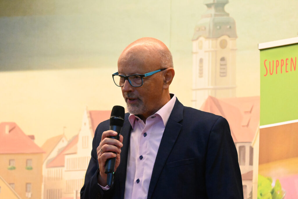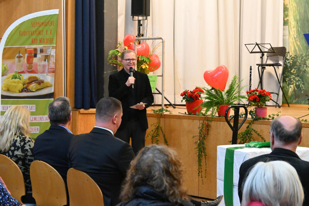 Rudi Heilig, 1. Vorsitzender der Suppenküche, hatte außer Gerlinde Kretschmann noch eine Menge Ehrengäste zu begrüßen: OB Matthias Henne, Pfarrer Bucher als Hausherr, Professor Rudolf Forcher mit Gattin, Thomas Manz mit Gattin, die Landtagsabgeordneten Petra Krebs und Raimund Haser. Einen Lacher erhielt Rudi Heilig für die Entschuldigung der Bundestagsabgeordneten mit der Bemerkung, „die sollen in Berlin was Vernüftiges tun“. Das Grußwort des Landrates war ebenfalls schnell abgehandelt. Der Landrat hatte einen Stellvertreter benannt, dieser hatte kurz vor der Veranstaltung abgesagt („Bin krank, ich kann nicht kommen, ich soll Ihnen die Grüße des Landrates bestellen“). Vom Kreistag begrüßte er Elke Müller, vom Kloster Reute sehr herzlich Schwester Maria Hannah in Begleitung der Schwestern Andrea und Regina. Besonders erfreut war er, dass viele soziale Einrichtungen durch ihre Repräsentanten vertreten waren.