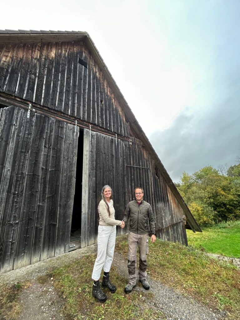 Übergabe eines Eulen-Brutkastens durch Dr. Carmen Pöhl vom Verein Landschaftsschützer Oberschwaben-Allgäu e.V. an Familie Fitz bei Eggmannsried. Foto: Landschaftsschützer