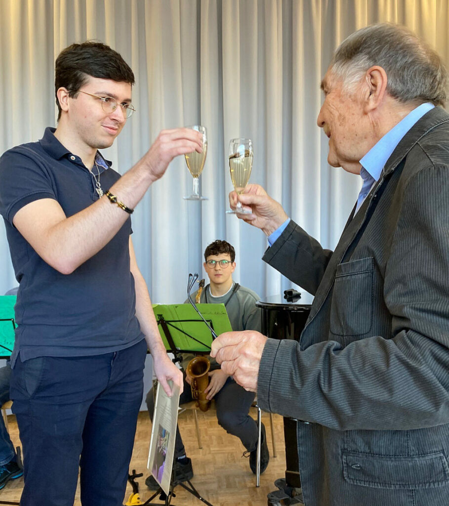 Das Violinen-Ensemble von Lehrerin Salome Hänsler eröffnete das musikalische Programm. Mit sanften Streichklängen konnten sie das Publikum überzeugen (Schüler: Rebekka Bareiß, Sergen Batur, Julia Brändle, Julia Emmendörfer, Magdalene Mast, Mario Pfob, Elisa Schuhmacher). Anschließend begrüßte der im vergangenen Sommer neu gewählte JMS-Vorstand Mario Pfob die zahlreich erschienenen Gäste und bedankte sich bei allen Helfern, die diese Veranstaltung erst möglich gemacht haben. Pfob erzählte vor allem von seinen persönlichen Erlebnissen mit Herrn Lutz, der ihn während seiner eigenen musikalischen Entwicklung stets begleitet und ermutigt hat. „Peter, Du bist das perfekte Beispiel dafür, dass Musik dem Körper guttut”, sagte Mario Pfob und gab seiner Hoffnung Ausdruck, dereinst mit 80 Jahren geistig und körperlich so fit zu sein wie Peter Lutz.