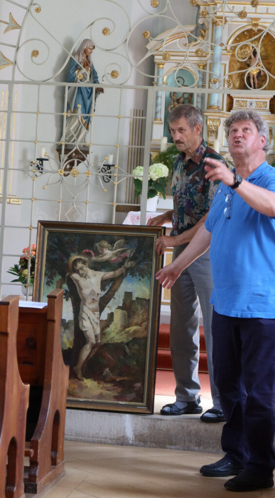 Fugel-Experte Günter Brutscher erklärt das Deckengemälde in St. Sebastian, das von dem namhaften Maler Gebhard Fugel (1863 – 1939) geschaffen wurde. Kapellenmesner Bernd Schmid hat ein Sebastiansgemälde dabei, welches von der Hand August Brauns stammt, auch dieser ein bedeutender Regionalkünstler. Das Braun’sche Gemälde wird Jahr für Jahr am Sebastianstag (20. Januar) bekränzt am Giebel der Waldkapelle oberhalb Haisterkirchs angebracht. Foto: Rudi Martin