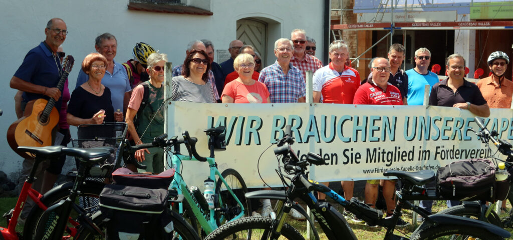Es waren mit den Kapellen in Hittelkofen, Osterhofen, Graben, der Sebastianskapelle auf dem Haidgauer Berg, in Ehrensberg, Hittisweiler und auf dem Weg zurück nach Haisterkirch die Wendelinuskapelle und schließlich, schon kurz vor dem Einkehrschwung ins Gasthaus „Rose“, noch mit der Spitzenkapelle (Bild: Rudi Martin), auch Gottvater-Kapelle genannt, acht Stationen auf der etwa 20 Kilometer langen Strecke. Leider konnte die bedeutende Osterhofer Kapelle Mariä Opferung noch nicht besichtigt werden, weil die Renovierungsarbeiten vermutlich erst nach der Sommerpause beginnen werden. Dennoch und gerade deswegen stellte sich die ganze Gruppe, gemeinsam mit dem Landtagsabgeordneten Raimund Haser und dem Bundestagsabgeordneten Axel Müller hinter das Plakat des Fördervereins Kapelle Osterhofen e. V. mit der Aufschrift „Wir brauchen unsere Kapelle“. Beide hatten sich auch schon im Vorfeld mit großem Engagement dafür eingesetzt, dass die Finanzierung der Kapellenrenovation möglich wurde.