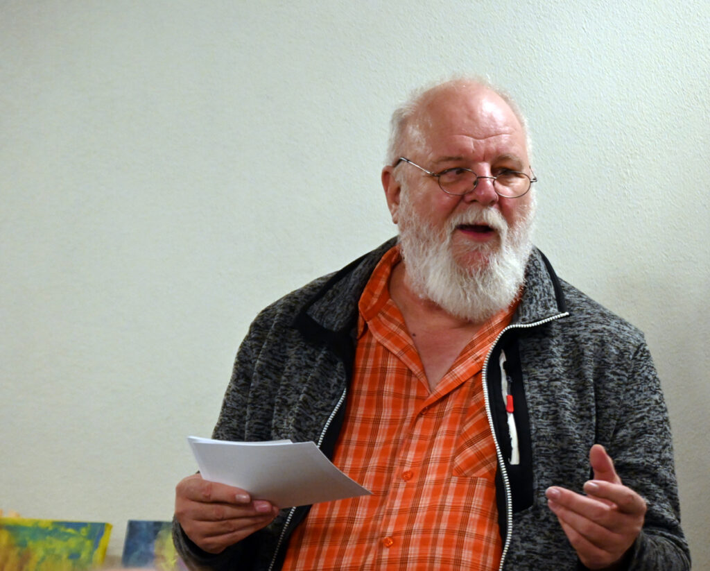 Jeder hat ein Glas vor sich. Wie in einem Gasthaus “Zum Bräuhaus“ nicht anders zu erwarten, die meisten mit einem Weizen oder einem Hellen drin. Und los geht’s. Nein, Paul Sägmüller erzählt nicht einfach, was in seinem Buch drinsteht. Er erzählt vom Werdegang des Buches. „Woischt Du, was an Netzplan isch?“, richtet er eine Frage an sein Publikum. Denn wenn Du ein Buch machen willst, brauchst du einen Plan. „Sonscht wird’s nix. Denn verzettleschte bloß.“ Vor zehn Jahren fing er an mit dem Buch über Rossberg.