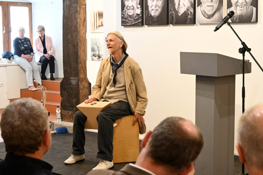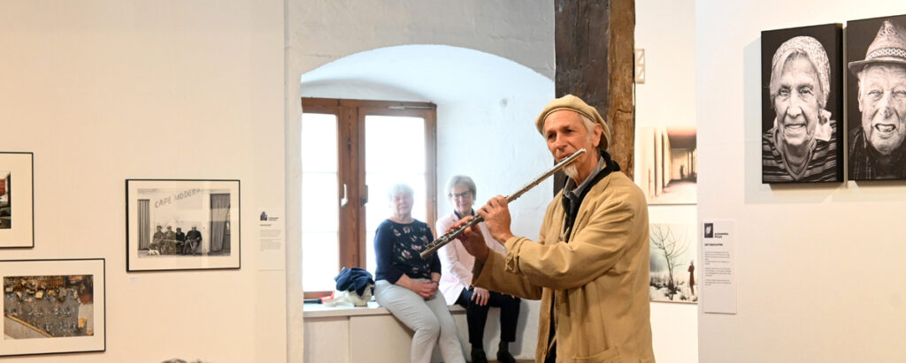 Für die Musik bei der Ausstellung sorgte Andi Merk mit nostalgischen Klängen aus dem Saxophon, der Querflöte, den Percussion-Trommeln und seiner Kehle.