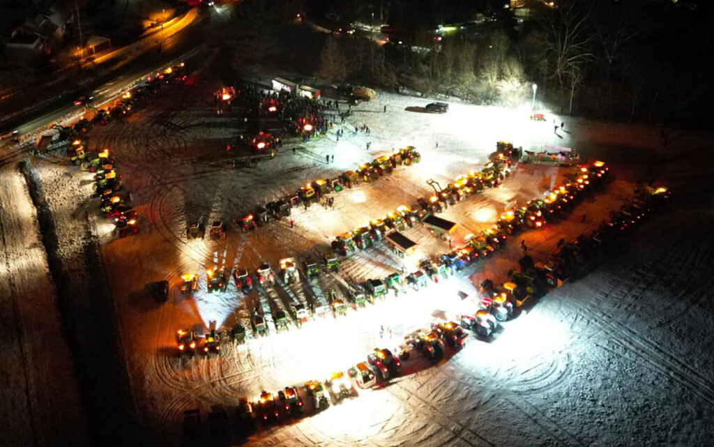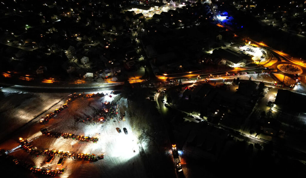 Bauernprotest in Bad Wurzach: Südlich der Umgehungsstraße (B 465) wurden am vergangenen Freitag 100 Traktoren in Reih und Glied geparkt. Rechts am Bildrand sieht man den Kreisverkehr, oben (erleuchtet) Bad Wurzachs Zentrum (Herrenstraße / Marktstraße). Drohnenaufnahme von “Schwaben Farming”, der Bildschirmzeitung kostenlos zur Verfügung gestellt.