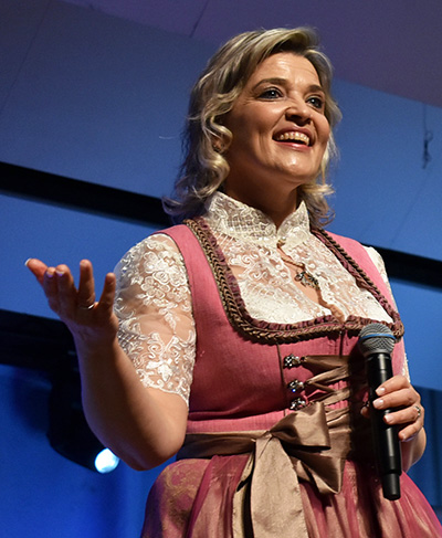Nadin Meypo (Bild) mischt nicht nur im Schlager- und Volksmusik-Genre erfolgreich mit, die Berlinerin mit ihrer sanften Stimme moderiert seit 2016 die „Südtiroler Heimatsterne“, die seitdem bereits rund 80.000 Zuschauer begeistert haben. „Vom leisen Lied in einer lauten Welt“ sang sie überzeugend gefühlvoll, präsentierte auch „Donna Lou“ und einige rockig-poppige Schlager. Sie animierte immer wieder zum Mitklatschen, auch mal zum Aufstehen und zum Mitsingen von weltbekannten Italo-Hits wie „Sempre tu“ oder „Mama Mia“ und landete schließlich bei den Capri-Fischern aus längst vergangenen Jahrzehnten.