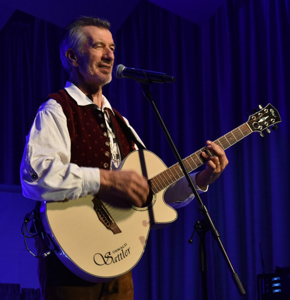 Wenn auch Oswald Sattler mit seiner Gitarre kaum einen Hauch von Choreografie bietet, steht er doch da wie ein Südtiroler Fels, ein Urgestein, ein Kerl von einem Mann mit wundervoller Tenorstimme. Die Gäste sind hingerissen, applaudieren, was das Zeug hält. „Ich könnt ohne Berge nicht leben“, singt der Mann, der in den Dolomiten zu Hause ist, und alle im Saal begleiten ihn stimmlich. Der „Rose von Südtirol“ folgt der „Sommerwind“, ein Welt-Klassiker, und noch ein Liebes- und ein Hoimat-Lied obendrauf, rauschender Beifall ertönt.