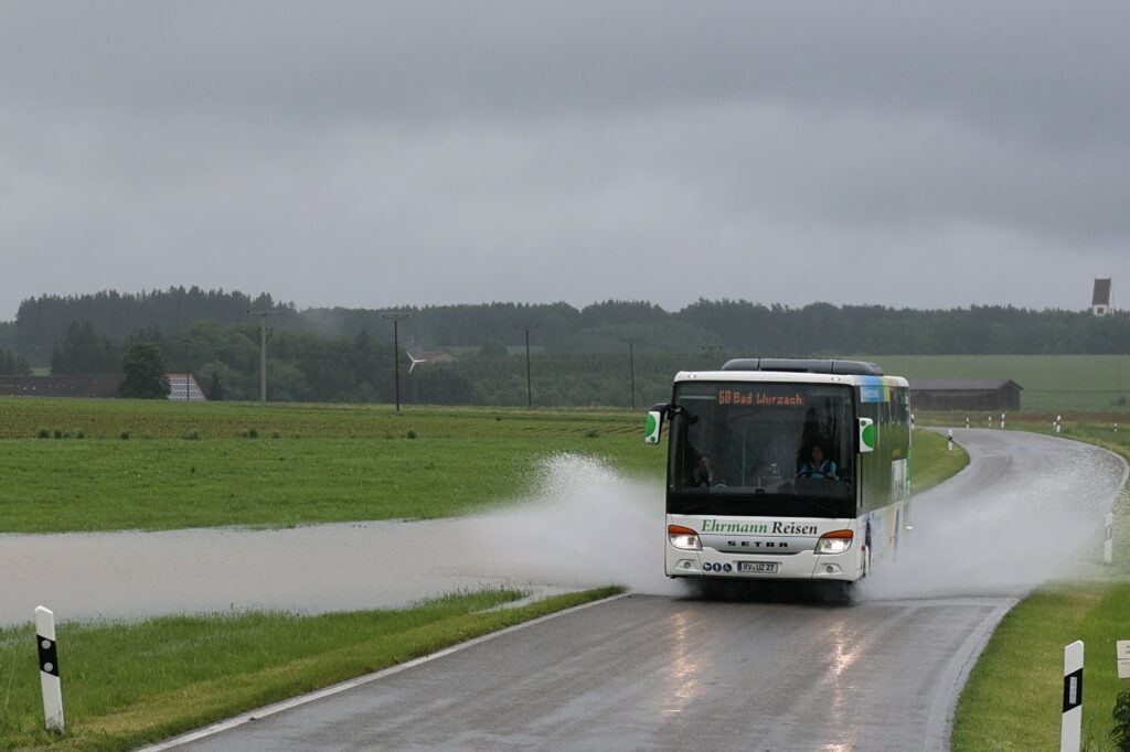 Der Bus fährt vorsichtig durch das stehende Wasser auf der Straße zwischen Hauerz und Ellwangen.