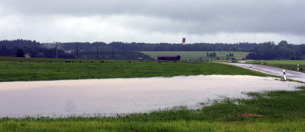 Grauer regenverhangener Himmel über der Hauerzer Kirche, im Vordergrund eine überschwemmte Wiese.