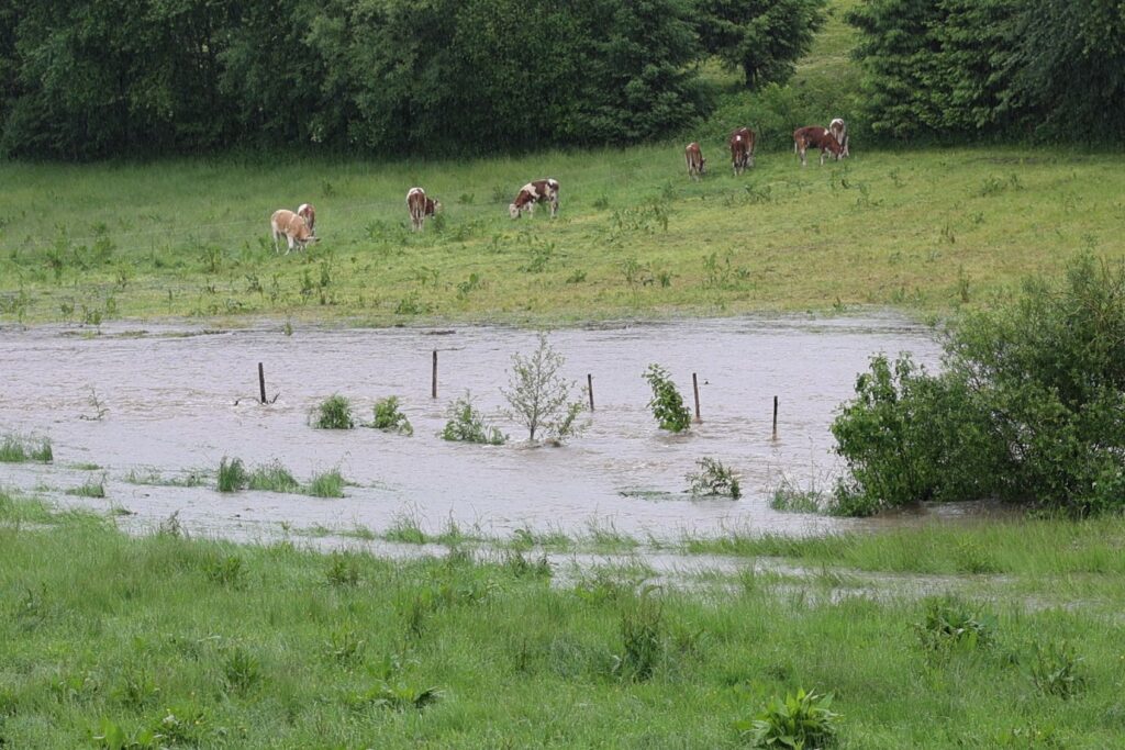 Noch können die Rinder friedlich grasen. Falls das Wasser steigt, müssen sie auf die obere Weide ziehen.