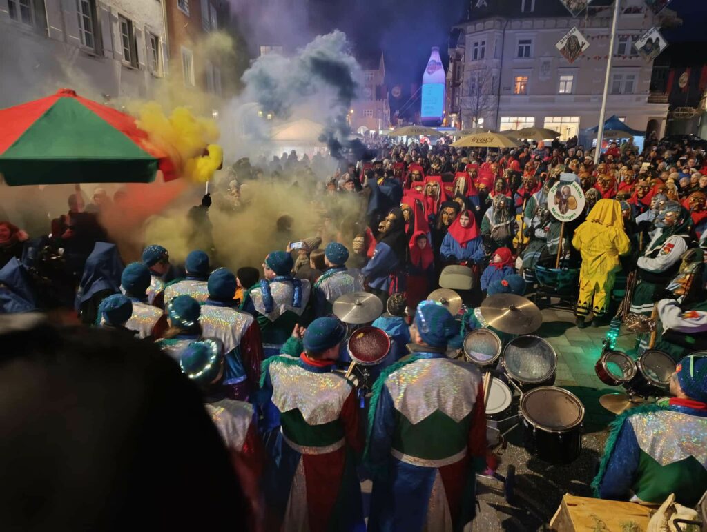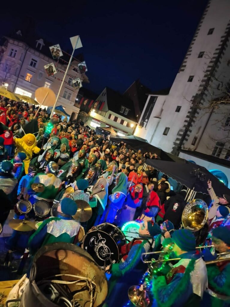Freitagabend am großen, schönen, neugestalteten Marktplatz in Isny am Blaserturm (Platz wurde 2024 eingeweiht): Fünf Hexengruppen standen in den Startlöchern und kamen von allen Seiten auf dem Marktplatz mit viel Pomp und Hexenrufen zusammen. Von weiter her kamen die Stadtbachhexen aus dem bayrischen Memmingen, ebenso die Deiflhexen aus Memmingerberg, näher hatten es die Burghexen aus Alttrauchburg. Natürlich waren auch die Nachbarzünfte dabei: Die Grünen Hexen und die Stadthexen aus Leutkirch sowie die Blätterhexen aus Wuchzenhofen („Heret na, d Blätter raschlet“); die durften ja gar nicht fehlen. Feuer brannten, es gab gute Verpflegung und ganz viel Musik.
