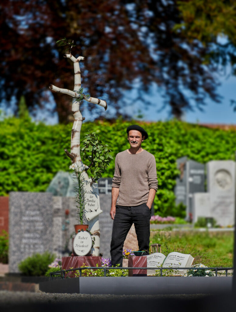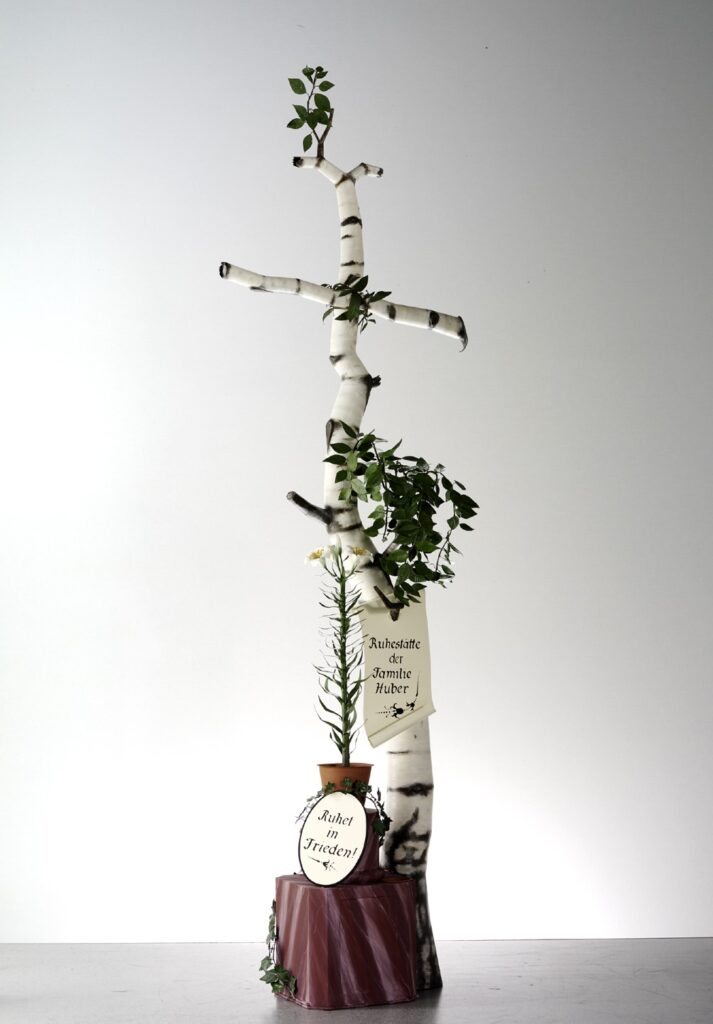 Die in aufwändigster Technik nachgeahmten Materialien und Pflanzen des Grabmals sind sehr bewusst gewählt. Birkenholz mit seiner hell leuchtenden Rinde fand und findet häufig Verwendung für mehr oder weniger improvisierte, nicht auf Dauer gedachte Grabkreuze. Zuerst kommen einem natürlich Soldatengräber, oft bekrönt von einem Stahlhelm, in den Sinn. Mit ihnen wurden zum Beispiel während der Feldzüge oder in den Wirren der letzten Kriegswochen auch in der Heimat einzelne Soldatengräber markiert. Heute erinnern hin und wieder Birkenkreuze am Straßenrand an tödlich verlaufene Verkehrsunfälle.