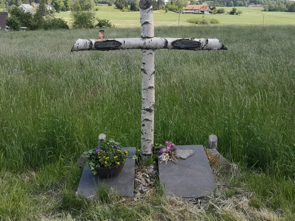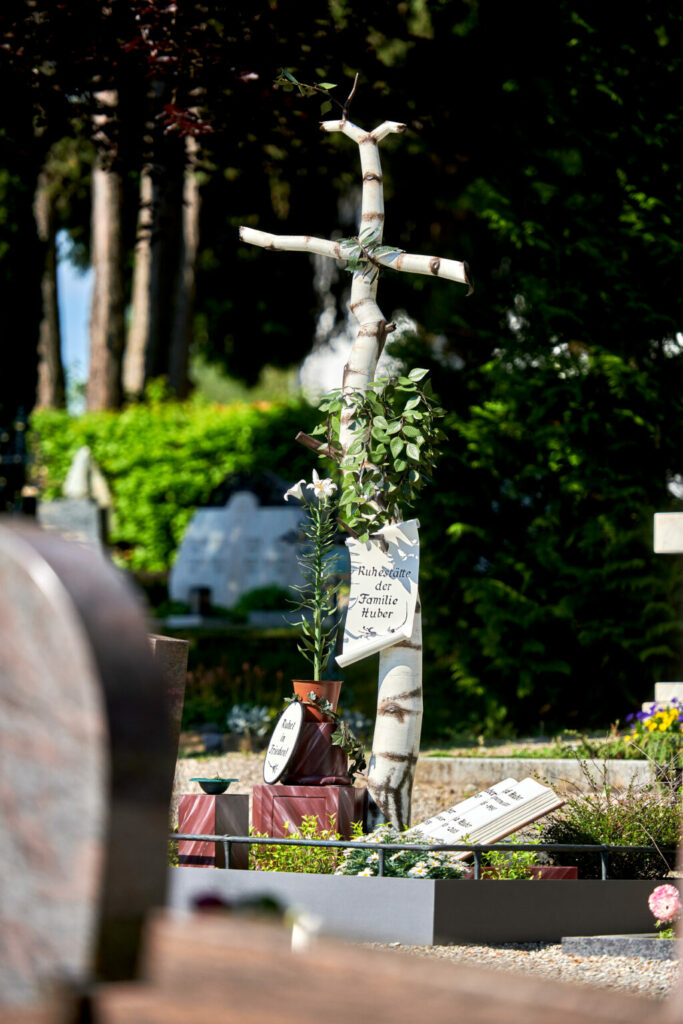 Im Zentrum der Grabstätte ein ungewöhnliches Birkenkreuz