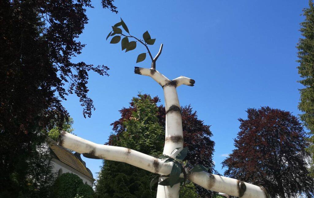 Die Birke, deren Blätter im Frühjahr als erste sprießen, steht symbolisch für das Erwachen der Natur, ganz allgemein für den Neubeginn und – im christlichen Sinn – auch für die Hoffnung auf die Auferstehung. In diesem Sinn ist bestimmt auch das grüne Birkenlaub zu verstehen, das hier aus dem an sich toten Birkenholz sprießt.