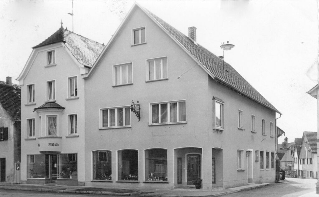Das Ladengeschäft nach dem Umbau (Anfang der 1960er-Jahre). Es wurde genutzt als Bankfiliale der LASPA (Württembergische Landessparkasse), geführt durch Herrn Kesenheimer, und später fand das “Brilleneck” von Karl-Heinz Schläfer dort lange Jahre seine Heimat. Heute ist ein Versicherungsbüro drin.