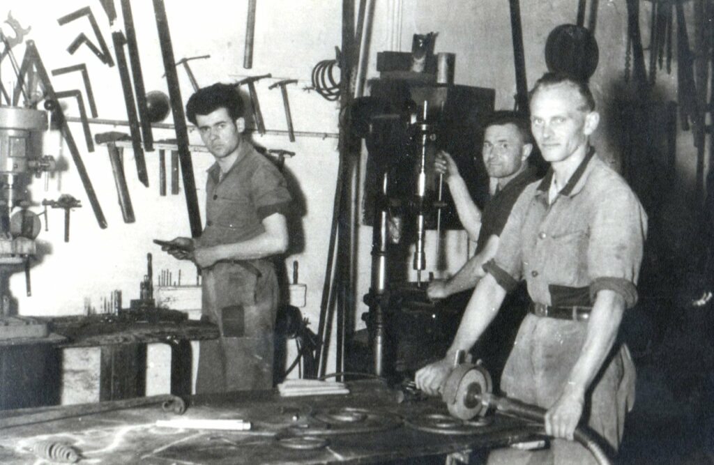 Gesellen der Schlosserei Nägele in der Werkstatt. Undatiert.