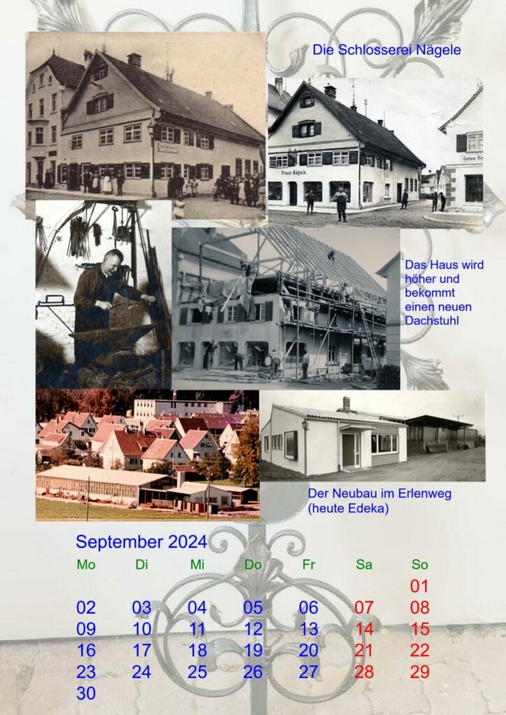 Zu den Fotos auf dem Kalenderblatt: Oben links eine Aufnahme von 1903, das Foto rechts daneben zeigt das Ladengeschäft um 1930, die Fotos in der mittleren Reihe: links Franz Nägele in seiner Werkstatt, rechts das Haus im Umbau um 1962. In den 1970er.Jahren wurde das Ladengeschäft geschlossen und die Schlosserei siedelte aus in den Erlenweg (beide Fotos unten). In den frühen 80er-Jahren wurde die Schlosserei zugemacht; auf diesem Gelände befindet sich heute der Edeka-Markt und die Schreinerei Stengele.