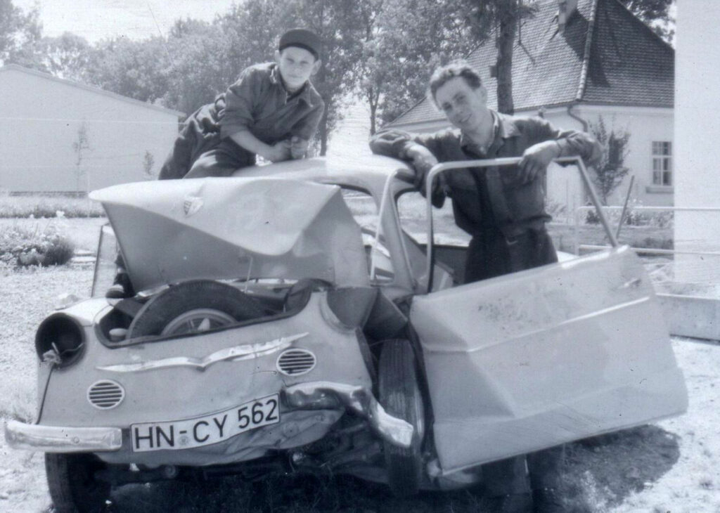 Ein NSU Prinz 3 in stark beschädigtem Zustand vor der Werkstatt.