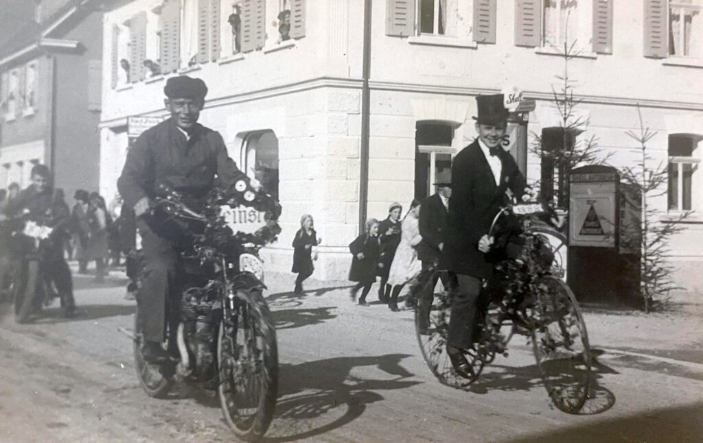 Alex Müller (links) auf einem Motorrad und Schuhmacher Christian Müller mit einem Zweirad von 1888.