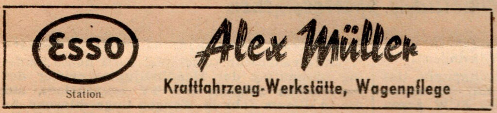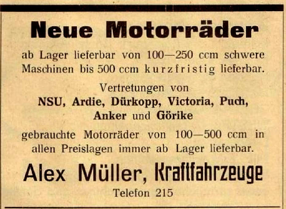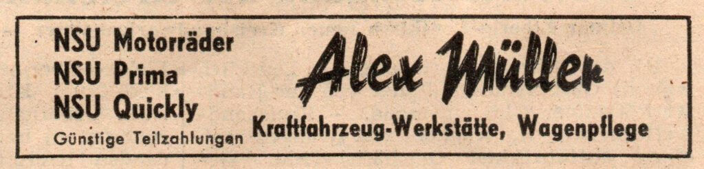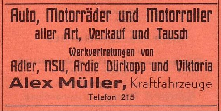 Die Geschichte der Kfz-Werkstatt von Alex Müller begann im März 1930 in der Hafnergasse. Alex Müller eröffnete sie zusammen mit seinem Bruder Helmut Müller. Von 1939 bis 1945 war die Werkstatt geschlossen. Nach dem Zweiten Weltkrieg, als Alex Müller aus Russland zurückgekommen war, startete man erneut. In der Hafnergasse, einer Seitengasse der Schlossstraße, wurde in einer großen Wellblechgarage gearbeitet. Motorräder und Mopeds wurden verkauft, gewartet und repariert. Große Marken wie NSU und Adler und Zweiräder kleinerer Hersteller wie Ardie, Dürkopp und Göricke waren im Angebot. Um den Verkauf anzukurbeln, wurde im Marktanzeiger, einer Beilage der „Schwäbischen Zeitung“, inseriert und an den Markttagen wurden die Zweiräder stolz in der Ortsmitte vor dem Laden Paulmichl präsentiert. Die ganze Familie musste mithelfen und die Motorräder von der Hafnergasse zum Laden Paulmichl schieben. Zu den Motoräder wurden auch die ersten Kleinwagen der Nachkriegszeit angeboten wie der Lloyd 600 und der Lloyd Alexander.