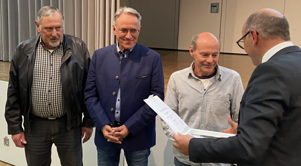 Bürgermeister Krattenmacher dankte Armin Notz (links) und Bernd Dux für jeweils 25 Jahre Ratsmitgliedschaft; Armin Notz fungiert zudem als Ortsvorsteher.