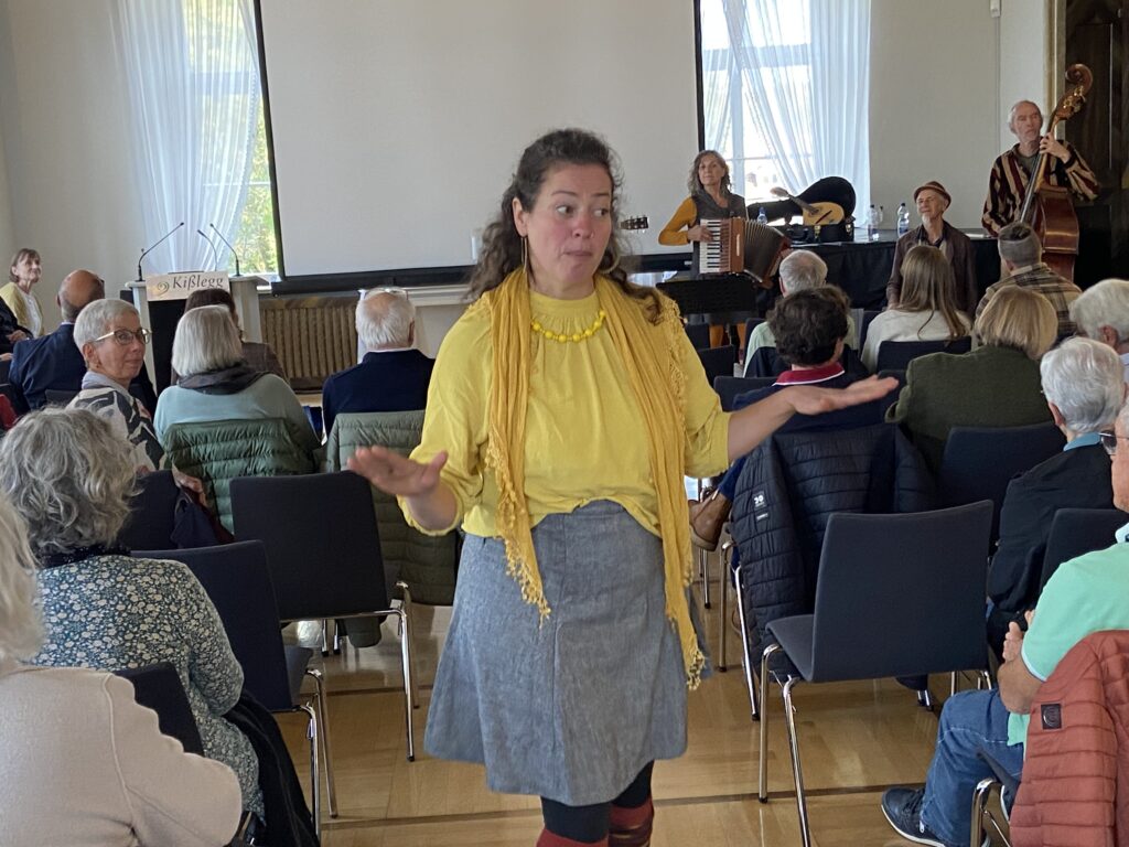 „Yesterday”. Gitarrist Thomas Linder eröffnete am Sonntagnachmittag den Reigen. Dann sang seine Kollegin Moni Bothe (Bild) „Weine nicht, wenn der Regen fällt”. Derweil hätten in Kißlegg 2024 so manche mehr als einen Grund dazu gehabt. Für Bürgermeister Dieter Krattenmacher deshalb auch das markanteste Kleidungsstück Kißlegg 2024: der Gummistiefel. Dieses Beinkleid so aktuell, dass es noch nicht als Ausstellungsstück auffiel.