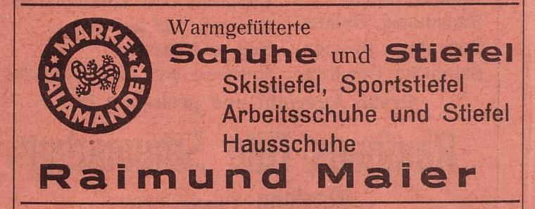 Bei Maier konnte man Schuhe kaufen und natürlich auch reparieren lassen. Ab 1896 wurde die Schuhmacherei von Dominikus Maier geführt, später umgebaut und seit den 50er-Jahren von Raimund Maier weitergeführt, bis 1966 Alois Paoli das Schuhgeschäft und die Schuhmacherwerkstatt übernahm und bis 1983 betrieb. Dann wurde das Haus abgebrochen und musste einem Neubau weichen, der bis zum heutigen Tag ein Versicherungsbüro und ein paar Wohnungen beinhaltet.