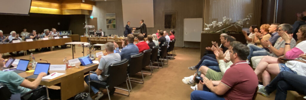 Daniel Gallasch bedankt sich stehend bei den Gemeinderäten für das einstimmige Votum. Foto: Julian Aicher