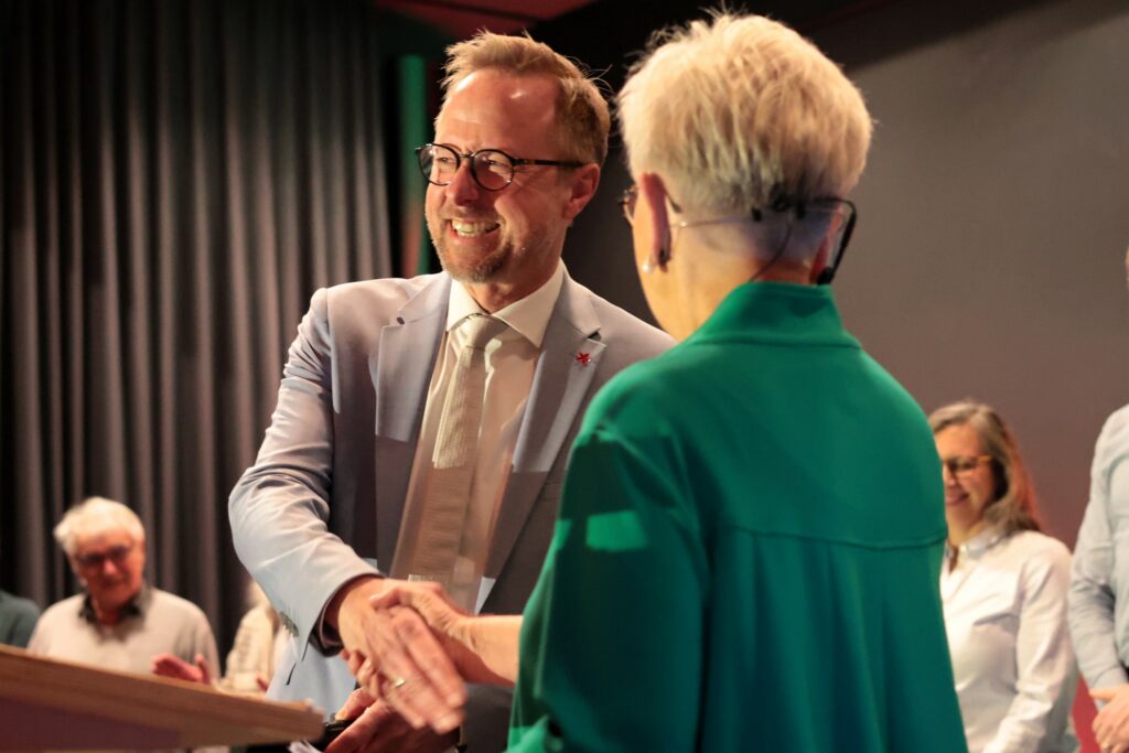 Carla Mayer gratuliert dem für eine dritte Amtszeit verpflichteten Thomas Kellenberger.