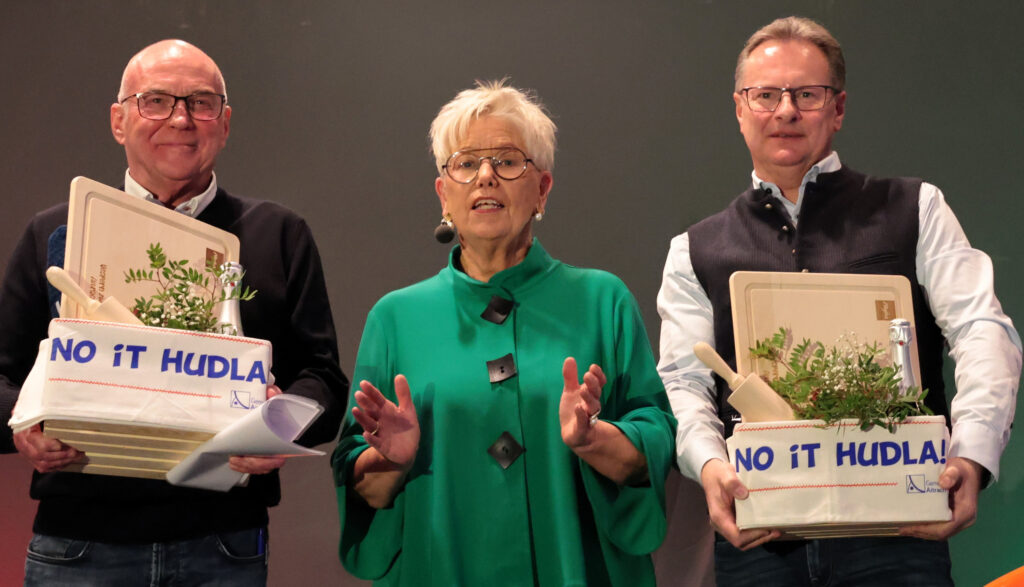 Carla Mayer dankt Romeo Hofer (links) und Rainer Sigg für die tolle Talkshow mit diesen Präsenten.