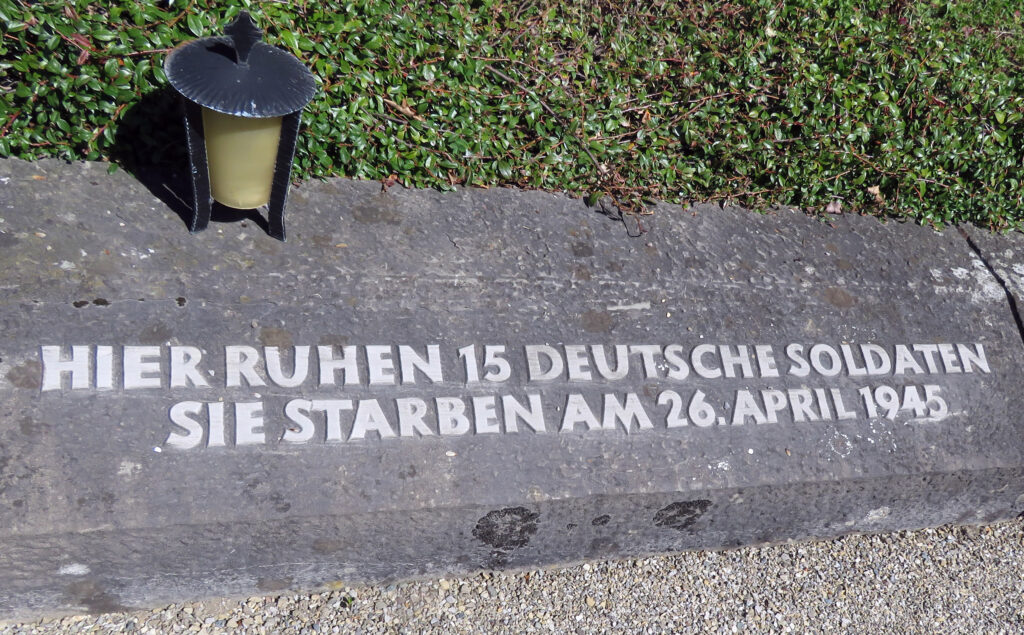Nicht weit davon kann man heute noch die Stelle ausmachen, wo die fünfzehn Soldaten ihr Leben lassen mussten. Links der Gedenkstätte führt in nördlicher Richtung ein leicht ansteigender Fahrweg in den Wald hinauf. Nach etwa zweihundert Metern sind an fünf Bäumen in Mannshöhe noch Einschlagstellen von Gewehrkugeln zu sehen, stumme Zeugen der peitschenden Schüsse des Hinrichtungskommandos, das am 26. April 1945 hier sein schauriges Werk vollbringen musste.